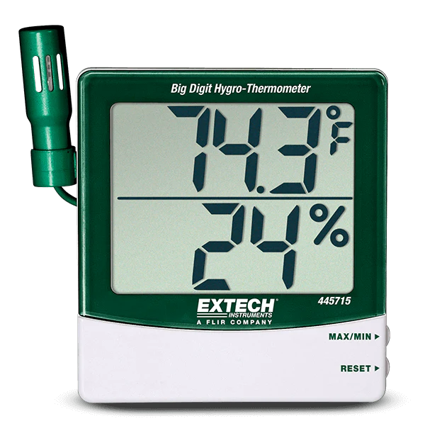 يتميز مقياس الرطوبة ودرجة الحرارة الرقمي الكبير من إكستك بوحدة استشعار قابلة للتمديد مع كابل بطول 45.7 سم (18 بوصة). يقيس الرطوبة من 10% رطوبة نسبية إلى 99% رطوبة نسبية ± 4% رطوبة نسبية، ودرجة الحرارة من -10°C إلى 60°C ± 1°C (14°F إلى 140°F ± 1.8°F). يتضمن هذا الجهاز أيضًا وظائف القيمة القصوى/الحد الأدنى والراحة، بالإضافة إلى وجود عمود ضبط معايرة خلفي مع زجاجات معايرة رطوبة نسبية اختيارية. يأتي كاملاً مع حامل مدمج، وحامل تثبيت، واستشعار، وبطارية AAA واحدة.