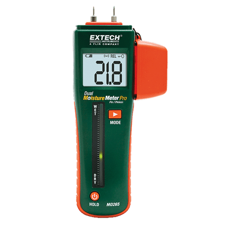 جهاز من اكستيك MO265 مقياس رطوبة متعدد الاستخدامات يجمع بين تقنيات القياس بالإبرة ودون الإبرة. وهو مصمم لقياس نسبة الرطوبة في الخشب ومواد البناء الأخرى، مما يجعله أداة أساسية للمحترفين في مجالات الترميم والبناء والتفتيش.