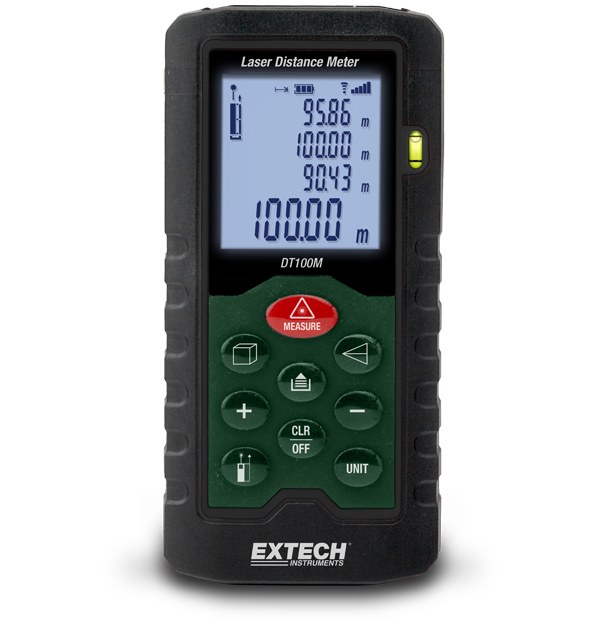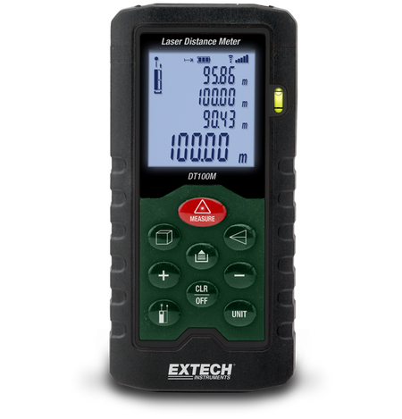 يُقيس جهاز Extech DT100M المسافات حتى 330 قدمًا (100 متر). يمكنه حساب المساحة والحجم، كما يسمح نظرية فيثاغورس المدمجة للمستخدم بأخذ قياسات غير مباشرة. تشمل الميزات الأخرى القياس المستمر مع تتبع المسافة القصوى/الحد الأدنى، وذاكرة 20 نقطة، وإضافة/طرح القراءات المتسلسلة، ومرجع الحافة الأمامية أو الخلفية، ووظيفة تحديد المواقع. شاشة LCD كبيرة رباعية الإضاءة الخلفية وهيكل مزدوج الصب. يحتوي أيضًا على مستوى فقاعي مدمج عملي، ويأتي مع حزام معصم وبطاريات.