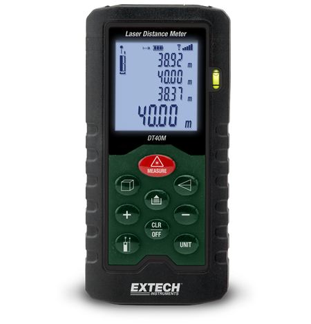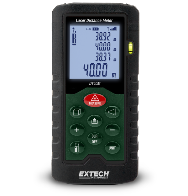 يُقيس جهاز Extech DT40M المسافات حتى 40 مترًا (131 قدمًا). يمكنه حساب المساحة والحجم، ويسمح قانون فيثاغورس المدمج للمستخدم بأخذ قياسات غير مباشرة. ومن الميزات الأخرى القياس المستمر مع تتبع الحد الأدنى/الأقصى للمسافة، وذاكرة تخزين 20 نقطة، وإضافة/طرح القراءات المتسلسلة، وإشارة حافة أمامية أو خلفية، ووظيفة تحديد المواقع. شاشة LCD كبيرة رباعية الإضاءة الخلفية وهيكل مزدوج الصب. يحتوي أيضًا على مستوى فقاعي مدمج عملي، ويأتي مع حزام معصم وبطاريات.