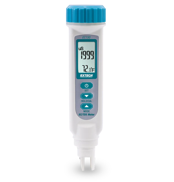 جهاز قياس الموصلية/إجمالي المواد الذائبة/درجة الحرارة إكستش EC150 مزود بحساس متعدد النطاقات عالي الدقة. يتميز بإيقاف التشغيل التلقائي مع إمكانية تعطيله، ومعامل تحويل قابل للتعديل من الموصلية إلى إجمالي المواد الذائبة من 0.4 إلى 1.0، وحفظ البيانات، وإشارة انخفاض مستوى البطارية. يتحمل التصميم المقاوم للماء البيئات الرطبة ويُطابق معيار IP65. يتضمن الجهاز، وغطاء واقي للحساس، وأربع بطاريات زر LR44.