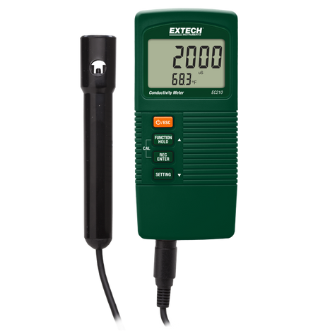 يُعد جهاز قياس الموصلية Extech EC210 جهازًا محمولاً وصغير الحجم. يستخدم الجهاز إلكترودًا مركبًا من قضيب الكربون طويل العمر لقياس الموصلية، وكمية المواد المذابة الكلية (TDS)، ودرجة الحرارة. يتميز الجهاز بثلاثة نطاقات لقياس الموصلية وكمية المواد المذابة الكلية، بالإضافة إلى عامل تعويض درجة الحرارة القابل للتعديل للحفاظ على الدقة. وتشمل وحدات القياس: µS/cm، mS/cm، ppm، °F، و °C.