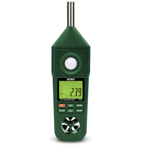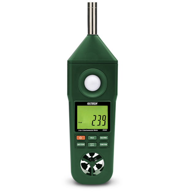 يُعد جهاز من اكستيك EN300 جهاز قياس بيئي متين متعدد الوظائف (5 في 1) مصمم لقياس الرطوبة ودرجة الحرارة وسرعة الهواء والضوء ومستويات الصوت. وهو مزود بركيزة ثلاثية القوائم وواجهة كمبيوتر RS-232، مما يجعله مناسبًا لمجموعة متنوعة من التطبيقات في مراقبة البيئة.