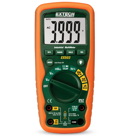يُعد جهاز من اكستيك EX503A مقياسًا متعدد الاستخدامات صناعيًا متينًا مصممًا لإجراء مجموعة متنوعة من القياسات الكهربائية. يتميز بشاشة LCD كبيرة، وهو مصمم لتحمل البيئات القاسية، مما يجعله مناسبًا للتطبيقات الصناعية.