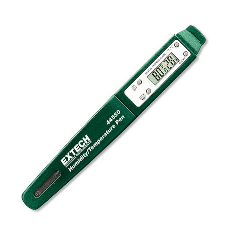 يُعد مقياس الرطوبة ودرجة الحرارة من اكستيك (النموذج: 44550) جهازًا صغيرًا بحجم القلم، مصممًا لقياس الرطوبة ودرجة الحرارة بسرعة ودقة. يتميز بشاشة عرض LCD مزدوجة تسمح للمستخدمين برؤية كلا القياسين في وقت واحد.