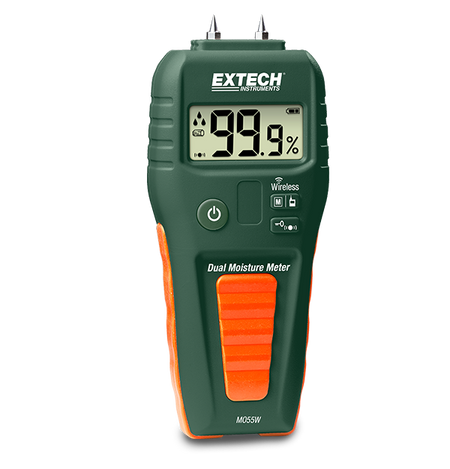 The EXTECH MO55W is a versatile moisture meter designed for quickly measuring moisture content in wood and other building materials. It features both pinless and direct pin measurement methods, making it suitable for various applications, including building restoration and moisture detection beneath flooring and carpeting.
