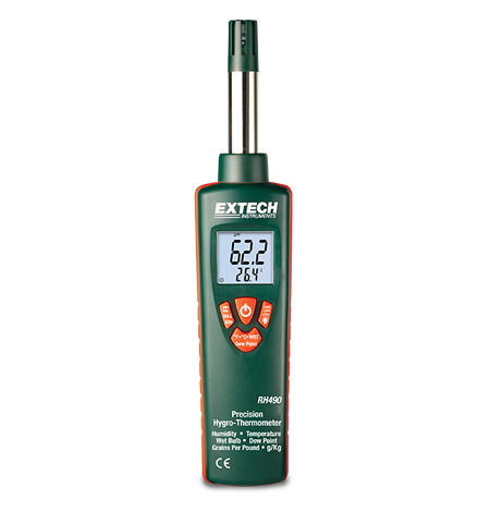 يُعد جهاز EXTECH RH490 مقياس رطوبة ودرجة حرارة دقيق، مصمم لقياس دقيق للرطوبة النسبية ودرجة الحرارة ونقطة الندى ودرجة حرارة الترمومتر الرطب. يُعد هذا الجهاز المحمول مثاليًا للمحترفين الذين يحتاجون إلى قراءات بيئية دقيقة في تطبيقات متنوعة.