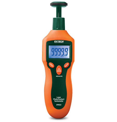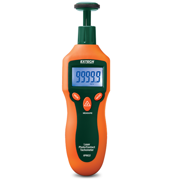 يوفر جهاز Extech RPM33 قياسات دورات في الدقيقة لكل من القياسات التلامسية (2 إلى 19,999 دورة في الدقيقة) وغير التلامسية (2 إلى 99,999 دورة في الدقيقة) لزيادة تعدد الاستخدامات. يسجل الجهاز بسلامة قياسات دورات في الدقيقة غير تلامسية موجهة بالليزر من مسافة تصل إلى 500 مم (1.6 قدم). يعرض جهاز RPM33 البيانات على شاشة LCD كبيرة من خمسة أرقام مع إضاءة خلفية. يخزن ويستدعي 10 مجموعات بيانات في الذاكرة مع أربعة معلمات (القياس، والحد الأقصى، والحد الأدنى، والمتوسط). يأتي الجهاز مع عجلة تلامس لقياس سرعة السطح الخطية من 0 إلى 1999.9 متر/دقيقة (0.2 إلى 6560 قدم/دقيقة) أو قياسات دورات في الدقيقة، وبطارية 9 فولت، وشريط عاكس، وحقيبة حمل، ودليل المستخدم.