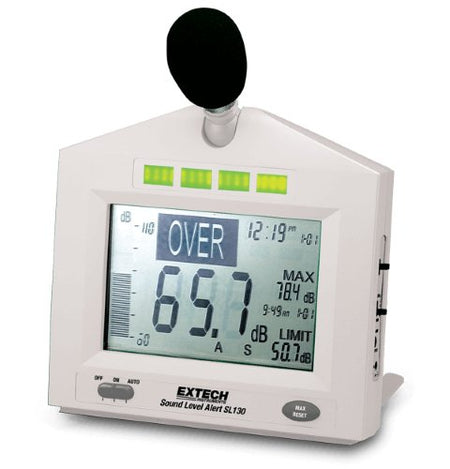 The SL130W is a sound level alert with alarm for continuous monitoring of sound levels. Ideal for industrial, hospital, auditoriums, schools and other areas where there is a need for being alerted when sound level reaches set points. Bright LEDs (red flashing or green) alert user when sound level is too high or too low - LEDs can be read from 30m (100ft). You can set the SL130 so the RED LEDs flash when the sound level is below the"LO" set point where people in the audience may not be able to hear. When the sound level is above the "LO" set point, the GREEN LEDs indicate the sound level is acceptable. You can reverse the Red and Green LEDs activation per user color preference. Wall, desk or tripod mount with optional 15ft (5m) microphone extension cable for remote monitoring. User settable high or low limit (30 to 130dB) with output to drive external relay module. Meets ANSI Type 2 and EN 60651 accuracy specs - compliant to OSHA. Complete with 100-240V AC 50/60Hz adapter and microphone wind cover. 8 x AA batteries (not included) can be used for monitoring function only without LED alert.