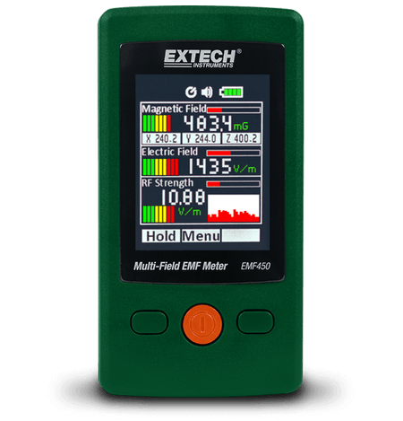 The EXTECH EMF450 is a sophisticated electromagnetic field meter designed to measure and display magnetic field, electric field, and radio frequency (RF) strength. This device is particularly useful for health and safety assessments related to electromagnetic exposure in various environments.