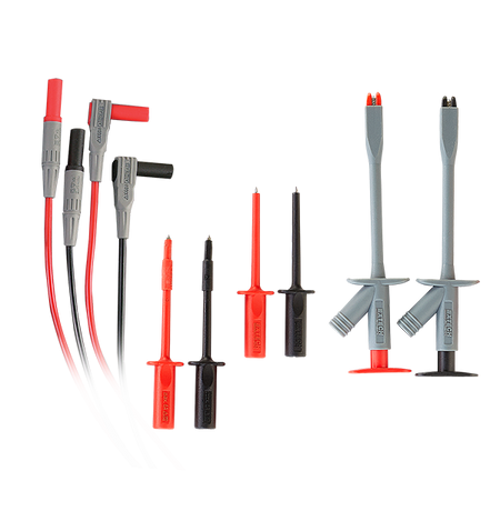 مجموعة أسلاك اختبار كهربائية إكستك TL810 معزولة مزدوجاً بتقييم CAT III-1000 فولت لحمايتك. تتضمن مجموعة أسلاك الاختبار الكهربائية المكونة من ثماني قطع، امتدادت أسلاك PVC بطول 40 بوصة مع قابس موز مفكك في كل طرف. كما تتضمن طرفي اختبار كهربائيين من الفولاذ المقاوم للصدأ حادين للغاية وطويلين إضافيين بطول 0.3 بوصة، وطرفي اختبار كهربائيين مسطحين من الفولاذ المقاوم للصدأ. بالإضافة إلى ذلك، تتضمن هذه المجموعة مشابك فكية قابلة للسحب يتم تشغيلها بمكبس، مع فتحة فكية واسعة تبلغ 0.75 بوصة.