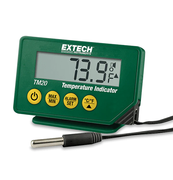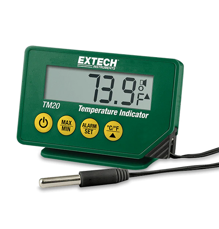 جهاز قياس درجة الحرارة المحكم TM20 من إكستك هو جهاز مؤشر درجة حرارة صغير مقاوم للماء مع مجس من الفولاذ المقاوم للصدأ. يتضمن مجس من الفولاذ المقاوم للصدأ بطول 20 مم (0.78 بوصة) وكابل بطول 2.9 متر (9.6 قدم). يقيس جهاز TM20 درجة الحرارة من -40 درجة مئوية إلى 70 درجة مئوية (-40 درجة فهرنهايت إلى 158 درجة فهرنهايت). يأتي كاملاً مع حامل، ومستشعر درجة الحرارة، وبطارية زر CR2032 3 فولت. معتمد من CE.