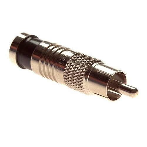 The RCA RG6 Compression Connector (Model: 18051C) is specifically designed for use with RG6 coaxial cables, providing a secure and reliable connection for various applications, including cable television (CATV), satellite systems, and broadband internet. The nickel plating enhances durability and resistance to corrosion, ensuring long-lasting performance.