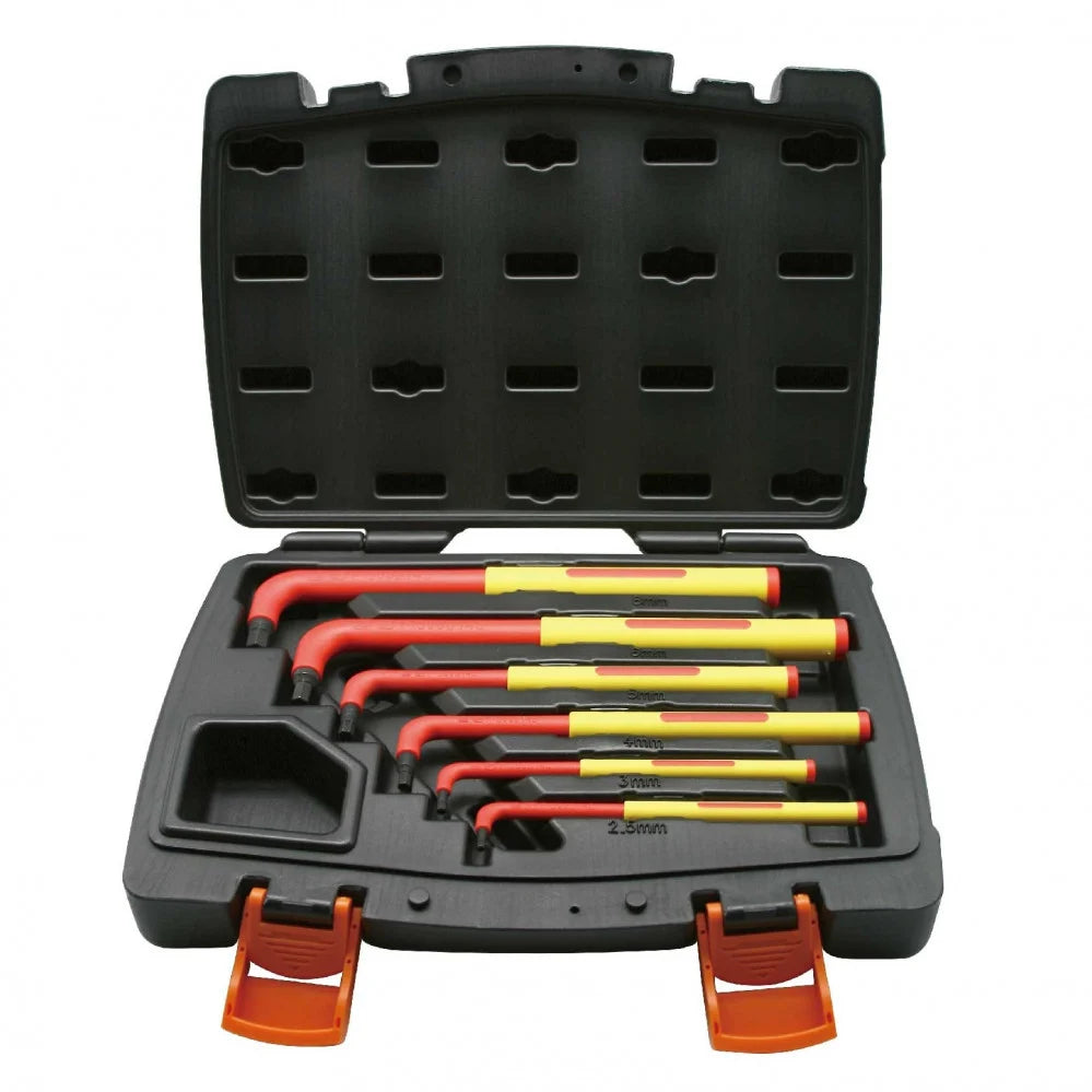 The Tower VDE-6 Allen Key Set is a 6-piece set of extra-long insulated hex keys made from chrome vanadium (CRV) steel. This set is designed for professional use, particularly in electrical applications, ensuring safety and efficiency when working with live circuits.
