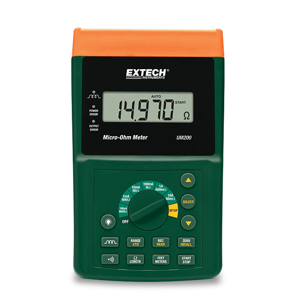 The Extech UM200 is a precision Micro-Ohm Meter which features a resolution down to 1 µΩ. The UM200 has 6 ranges with 3 sub-ranges in each current range. It features a 5-Digit backlit LCD, PC interface, auto or manual ranging, and a 10 A maximum test current. Store/Recall up to 3000 measurements. Complete with 4-wire cables with Kelvin clip connectors, rechargeable Li-Polymer battery, AC adapter/charger, software and USB cable, and soft carrying case.